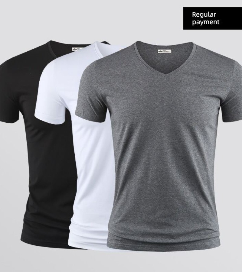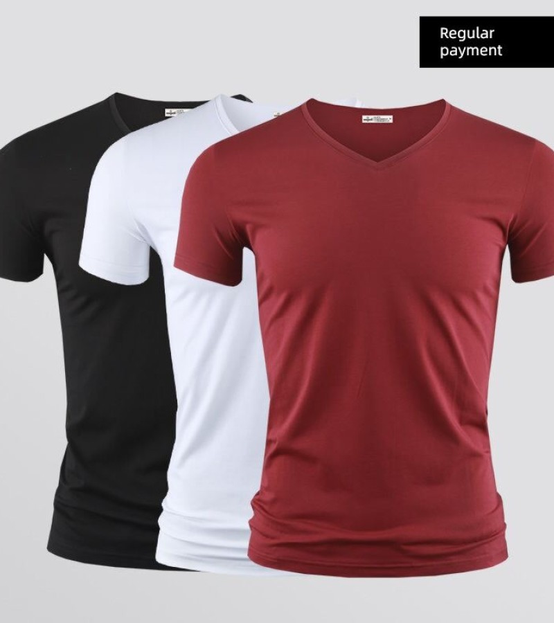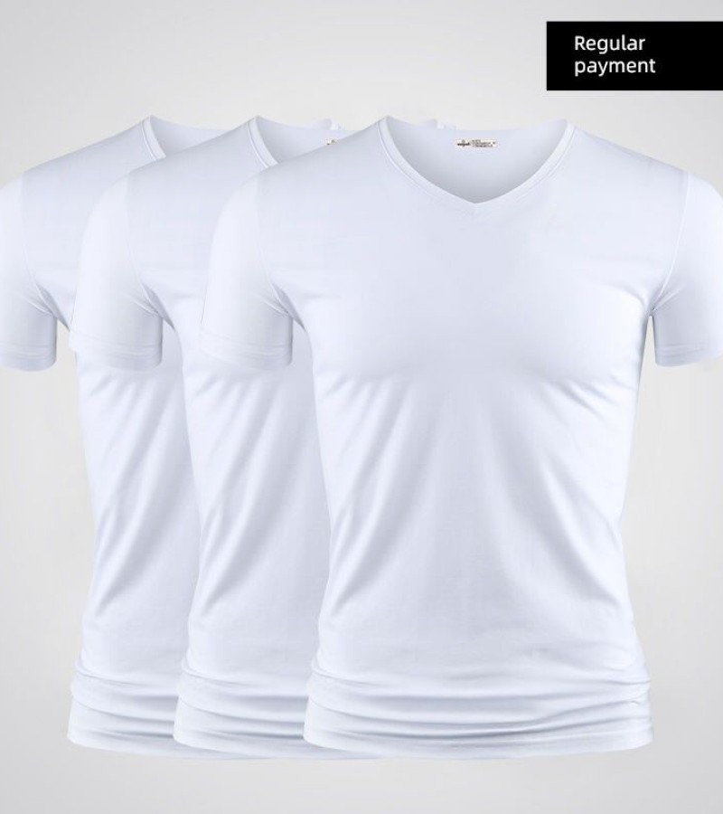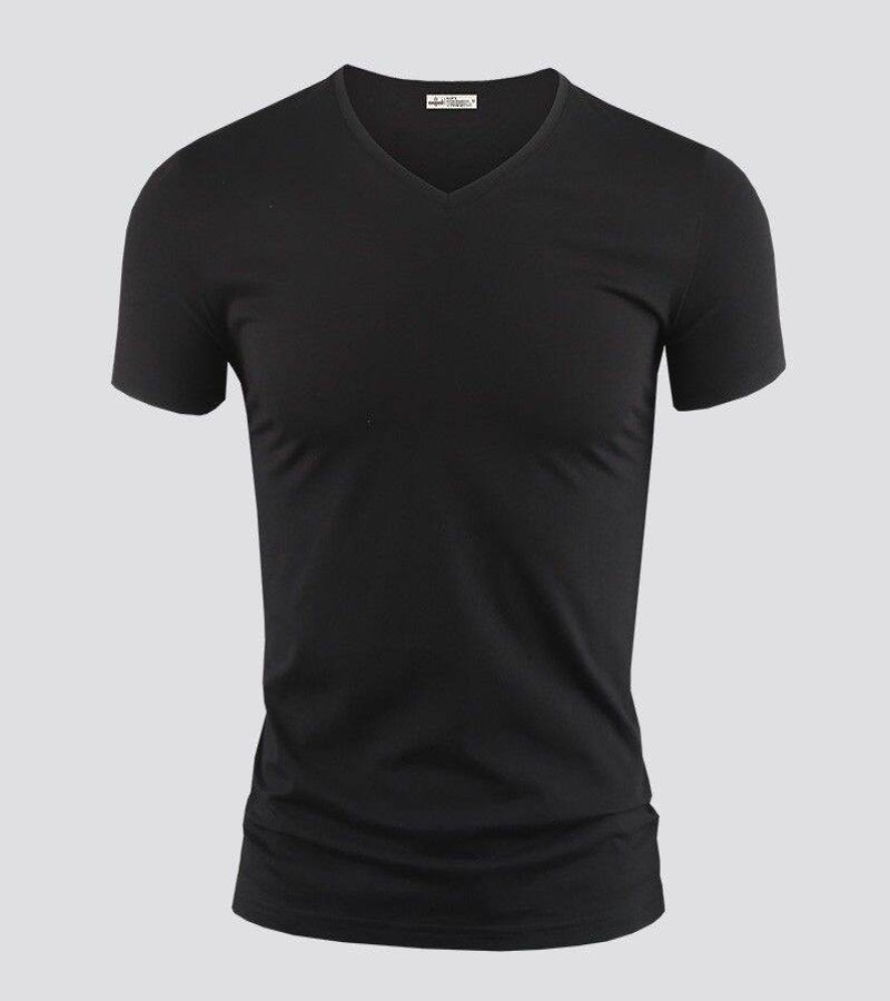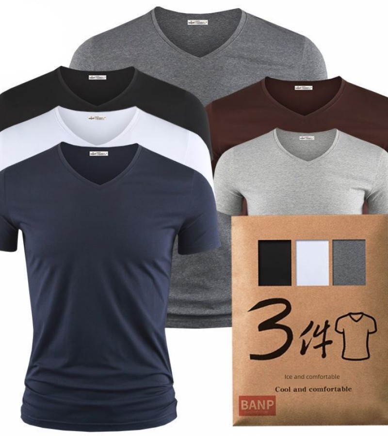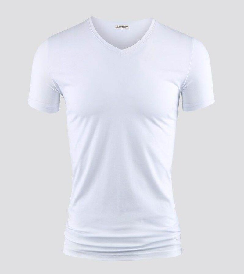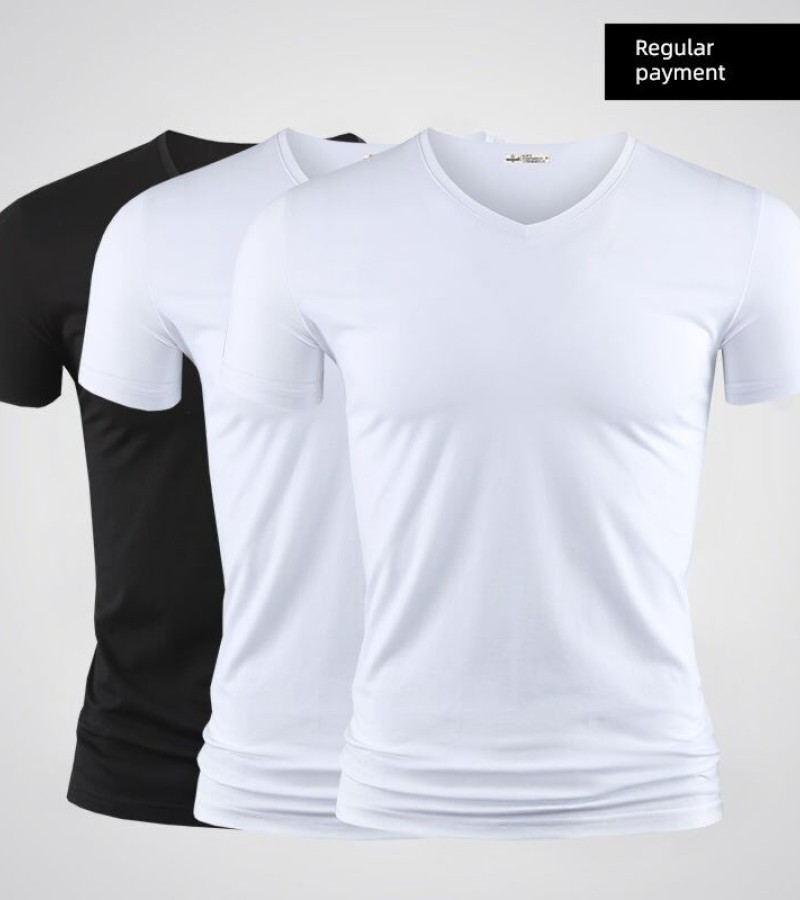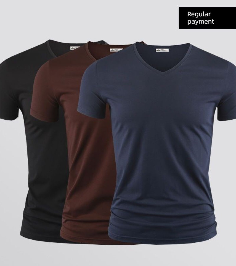 Modal男式纯色V领修身冰丝短袖衬衫