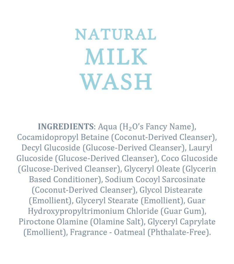 Aqua,Cocamidopropyl Betaine (Coconut-Derived Cleanser),Decyl Glucoside (Glucose-Derived Cleanser),Lauryl Glucoside (Glucose-Derived Cleanser),Coco Glucoside (Glucose-Derived Cleanser),Glyceryl Oleate (Glycerin Based Conditioner),Sodium Cocoyl Sarcosinate (Coconut-Derived Cleanser),Glycol Distearate (Emollient),Glyceryl Stearate (Emollient),Guar Hydroxypropyltrimonium Chloride (Guar Gum),Piroctone Olamine (Olamine Salt), ,Glyceryl Caprylate (Emollient), ,Fragrance - Oatmeal (Phthalate-Free).