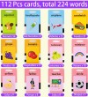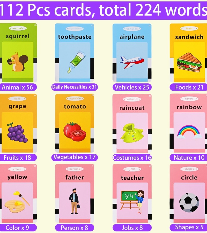 112 Pcs cards, total 224 words: Animal x 56; Daily necessities x 31 Vehicles x 25; Foods x 21 Fruits x 18; Vgetables x 17 Costumes x 16; Nature x 10 Color x 9; Person x 8 Jobs x 8; Shapes x 5