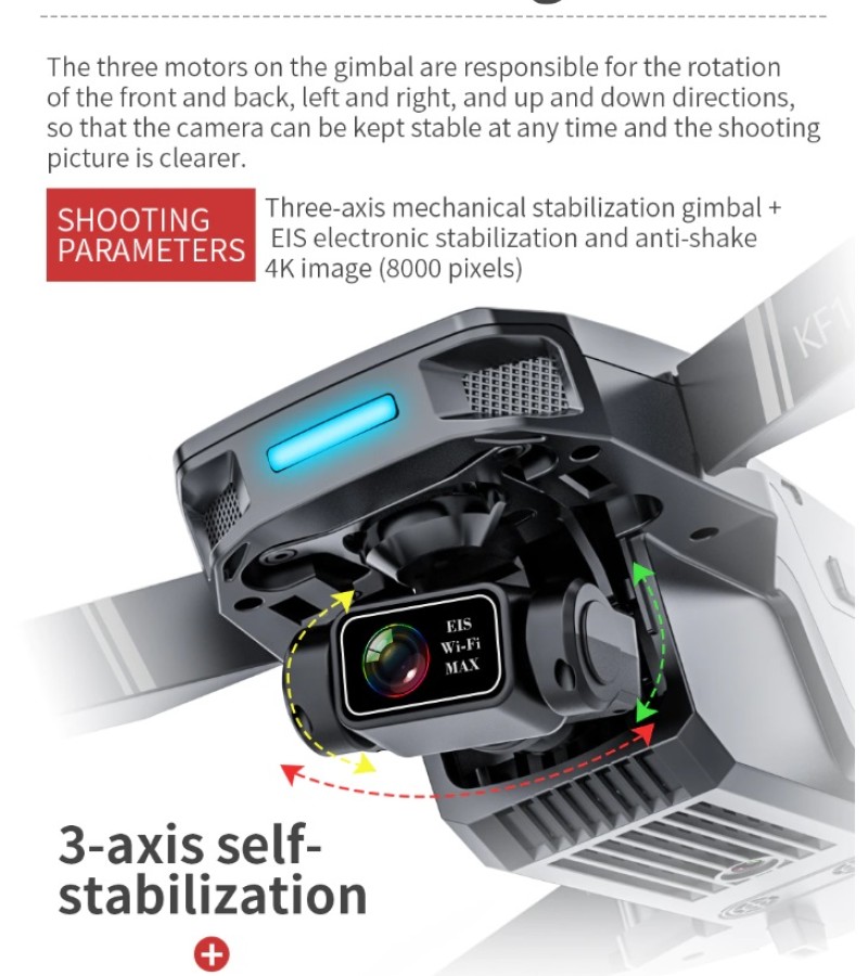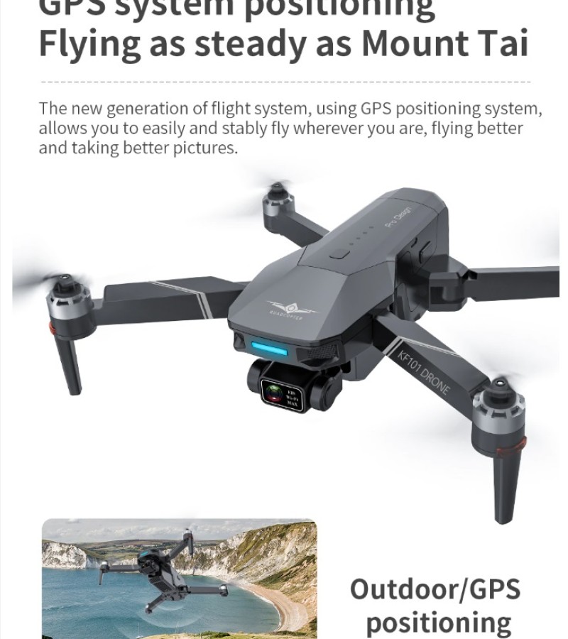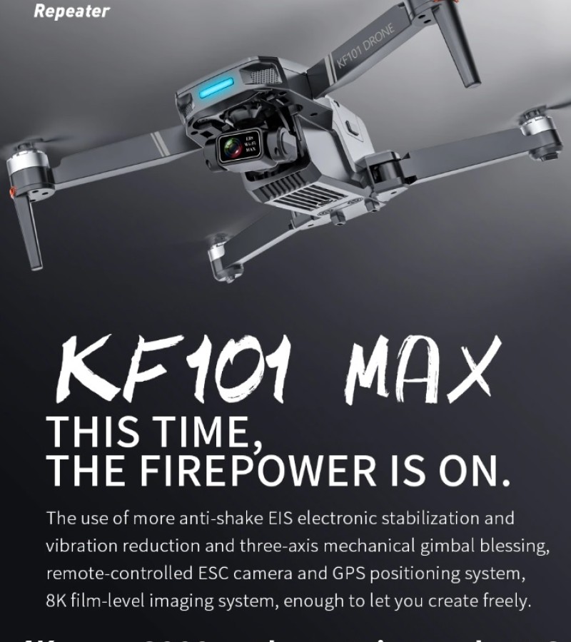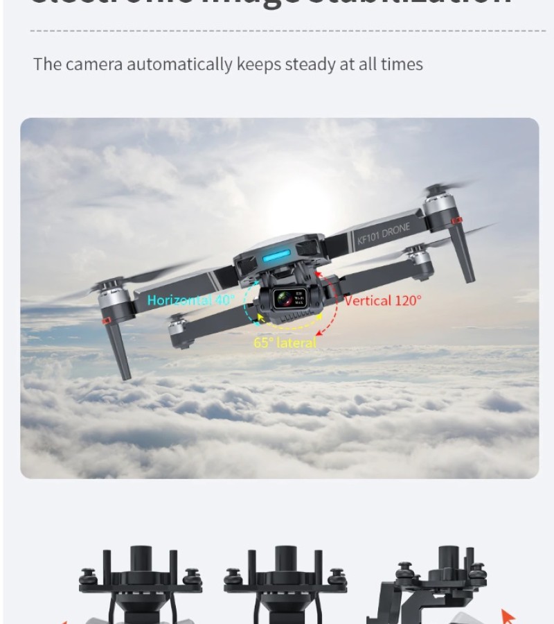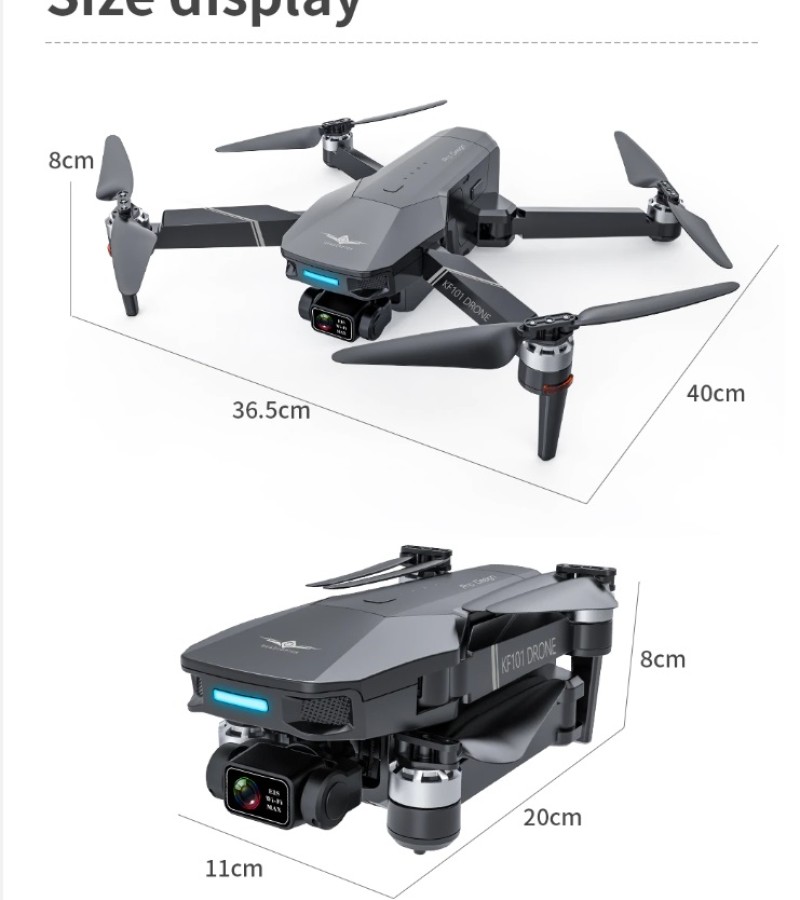 Item No: KF101 MAX Color :Dark Grey Frequency :2.4G (Remote Control) & 5G (Mobile Phone) Drone Battery :11.1V 2500mAh Control Distance : 3KM For KF101 MAX Wifi Image Transmission Distance : 3KM Flight Time : About 25 min Charging Time : About 6 hours USB Charging : 5V/2A Drone Weight : 613g (Needs drone registration in Singapore) Remote Control Battery : 3.7V 1000mAh Transmitter Charging Time : About 60min Transmitter Operating Time : About 10 hours Camera : 3 -Axis Electronic Stabilization Gimbal EIS electronic image stabilization Camera Camera Lens : 120° Photo Resolution (APP) : 3840*2160 P Video Resolution (APP) : 1280*720 P Photo Resolution (SD Card) : 2560*1440 P Video Resolution (SD Card) : 2560*1440 P Frame Rate : 30fps Photo Format : JPG Video Format : MP4 or AVI Adjustable Angle :90° Gesture Shooting : 1-3 M GPS Follow Me : 30 M+ SD Card Supports 32G-128G(Not Included) Mobile Device System Version : iOS 8.0 or later / Android 4.4.4 or later