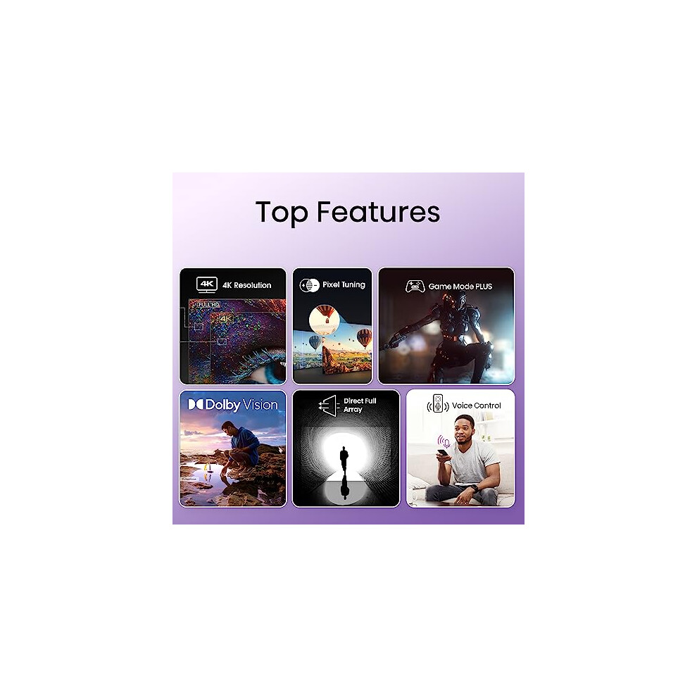 • [PixelTuning]PixelTuningisadynamicapproachtopictureoptimizationthathappensatthepixellevel.UsinganassortmentofintelligenttechnologieslikeGlobal/MicroDimming,NoiseReduction,Contrast,Brightness,andSharpnessTuningtoanalyzesignalsframebyframetooptimizethepictureforidealdetail,betterdynamiccontrast,reducednoisedeeperblacksandbrighterhighlights,andmore.